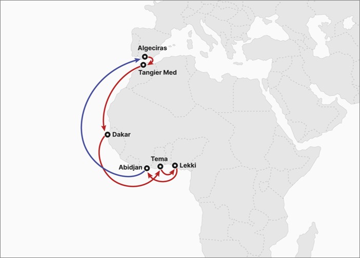 Algeciras (Spain) – Tangier (Morocco) – Dakar (Senegal) – Tema (Ghana) – Lekki (Nigeria) – Abidjan (Côte d’Ivoire) – Algeciras (Spain).
